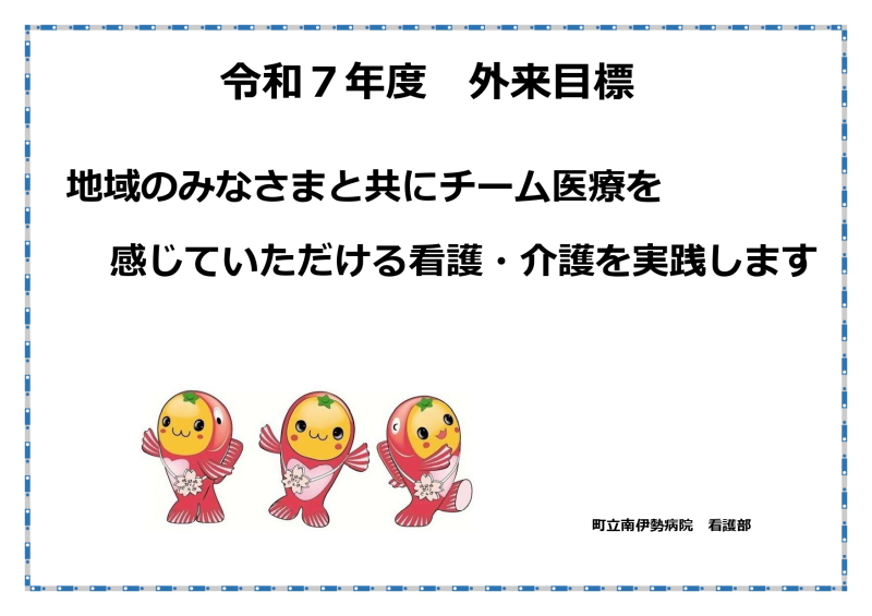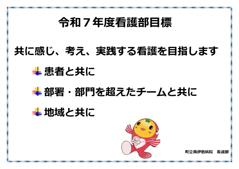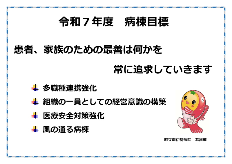南伊勢病院看護部は理念である「地域の皆さまに信頼される あたたかみのある看護・介護を目指します」を常に心におき、皆さまの看護・介護をさせていただいております。三重県で一番高齢化率の高い南伊勢町ですが、住み慣れた地域でいつまでも元気に過ごしていただけるよう、お手伝いしていきたいと思います。 看護師が慢性的に不足する中、「働き続けたい病院」を目指して日々奮闘しております。小さな病院ですが、職員の研修体制や有給休暇取得率アップ等でモチベーションを高めながら頑張っていきたいと思います。