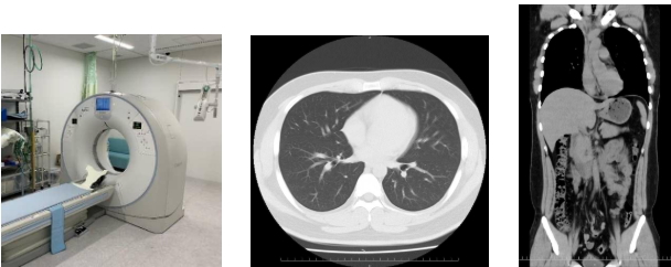 X 線を用いて体の輪切りの画像を撮影する検査です。ドーナツ状の機械に入り、体の周りを機械が回転し撮影していきます。