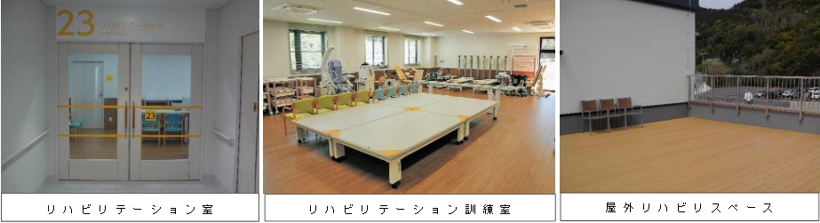 リハビリテーション訓練室は、広さ 134 ㎡であり、窓から山々の豊かな緑を眺めることができ、そこで理学療法士が外来・入院業務にあたっております。