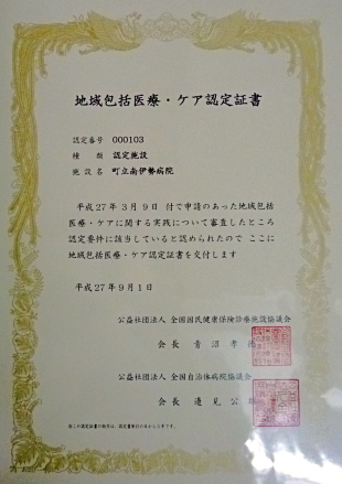 今回、当院では、地域包括医療・ケアを積極的に実践する医療機関として、公益社団法人 全国国民健康保険診療施設協議会から認定を受けました。今後、スタッフの質の向上や人員の強化などさらに地域住民の方々が安心して相談、利用していただける体制を充実させてまいりますのでよろしくお願いいたします。